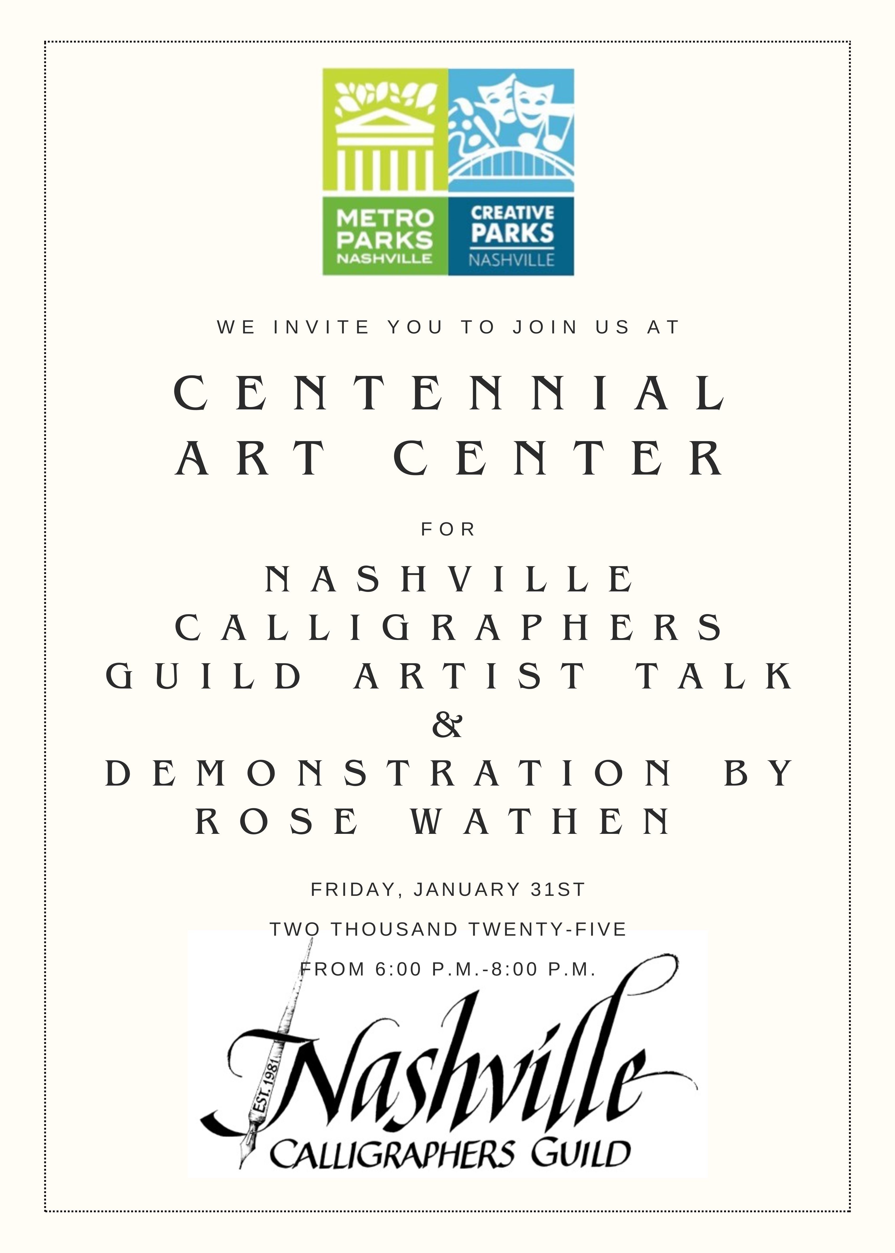 Also at this venue, the Nashville Calligraphers Guild has an art show going that lasts until March 3, 2025. You can enjoy looking at our lovely work and participate in the Artist Talk too.